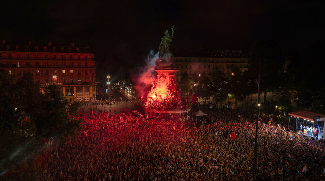 Menschen versammeln sich auf dem Platz der Republik während einer Demonstration gegen die rechtsnationale Rassemblement National, die in der ersten Runde der Parlamentswahlen einen deutlichen Vorsprung erzielte. Bei den Parlamentswahlen in Frankreich, bei denen viel auf dem Spiel steht, hat die rechtsnationale Rassemblement National in der ersten Runde der Wahl am Sonntag einen starken, aber nicht entscheidenden Vorsprung errungen, so die Prognosen der Meinungsforschungsinstitute.