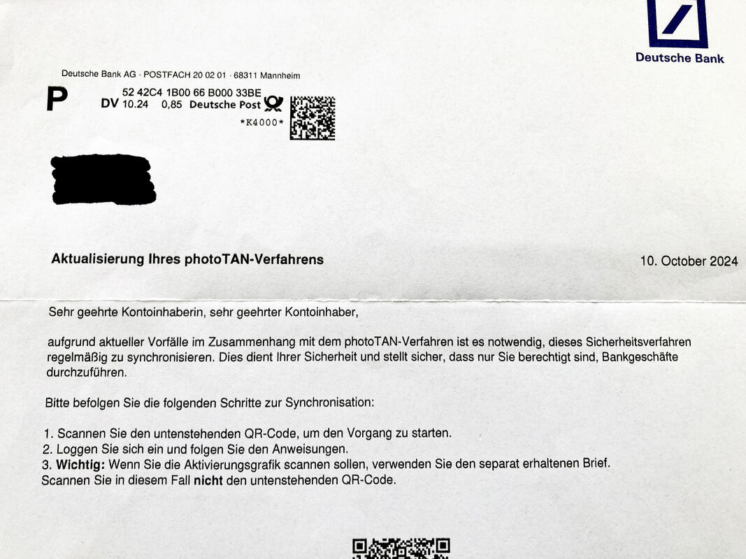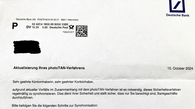 STUTTGART. Die Frau aus Bad Cannstatt wundert sich. Per Post hat sie einen Brief von der Deutschen Bank bekommen. »Aktualisierung Ihres photoTAN-Verfahrens« lautet die Betreffzeile. Danach wird der »sehr geehrten Kontoinhaberin« erklärt, das Sicherheitsverfahren beim Online-Banking müsse »aufgrund aktueller Vorfälle« aus Sicherheitsgründen synchronisiert werden. Dazu solle sie den aufgedruckten QR-Code scannen. Das freilich tut sie nicht – denn sie ist gar keine Kundin der Deutschen Bank.