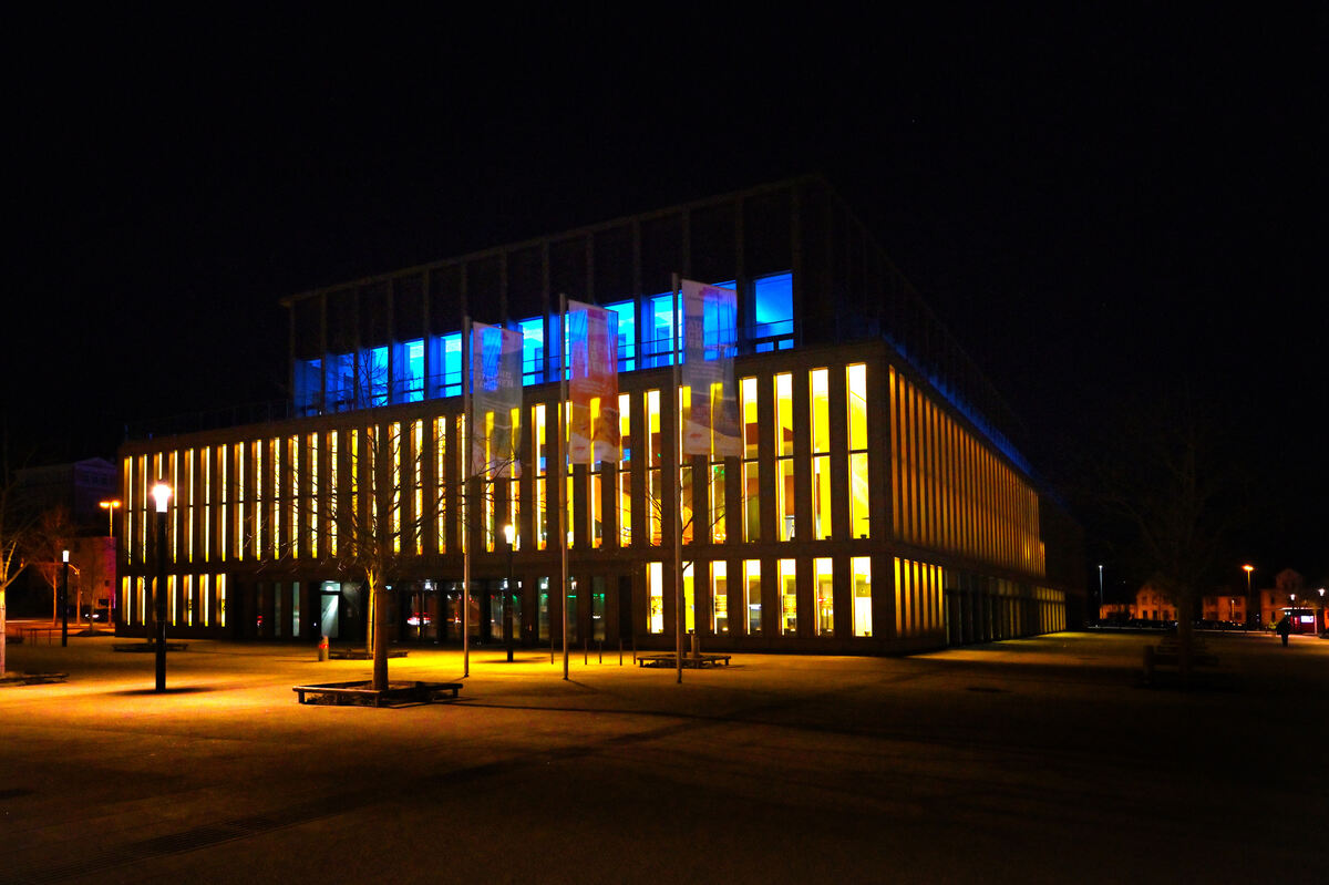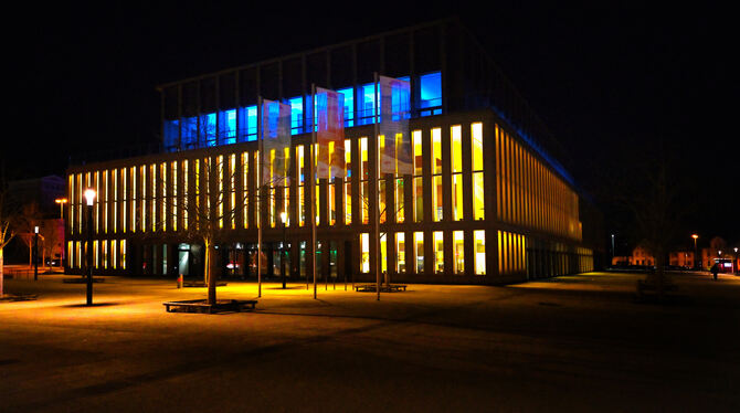 Die Reutlinger Stadthalle leuchtet in den Farben der Ukraine.