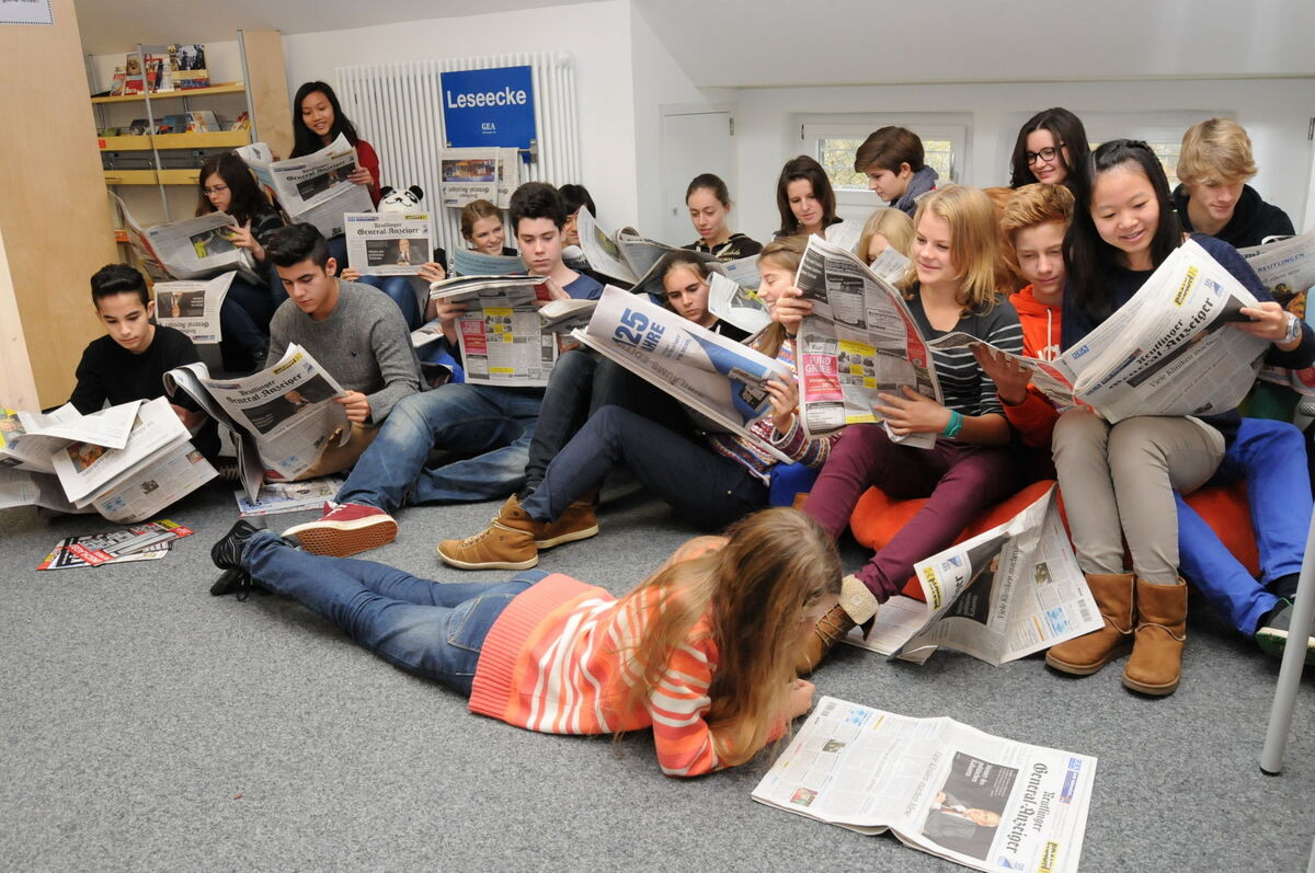 Schüler des Johannes-Kepler-Gymnasiums Reutlingen bei der Zeitungslektüre. FOTO: MEYER
