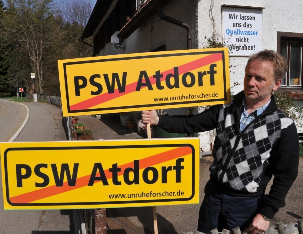 Der Vorsitzende der Bürgerinitiative gegen den Bau des Pumspeicherwerks Atdorf bei Herrischried im Südschwarzwald, Klaus Stöcklin, hält zwei Protestplakate in der Hand.