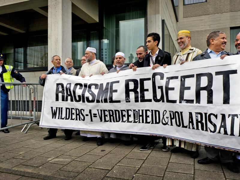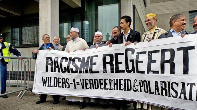 Drinnen Verhandlung, draußen Proteste: Muslime demonstrieren vor dem Gerichtsgebäude in Amsterdam gegen Wilders.