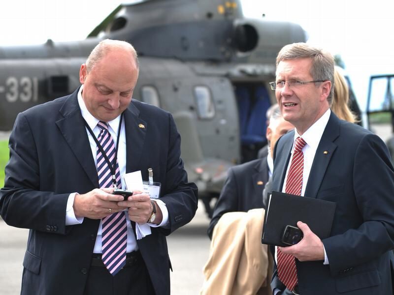 Christian Wulff (r) und sein damaliger Sprecher Olaf Glaeseker im Herbst 2010 auf einem Flugplatz in Lausanne. Foto: Rainer Jensen