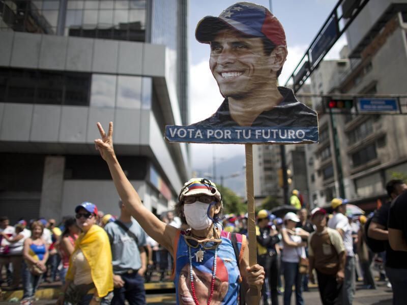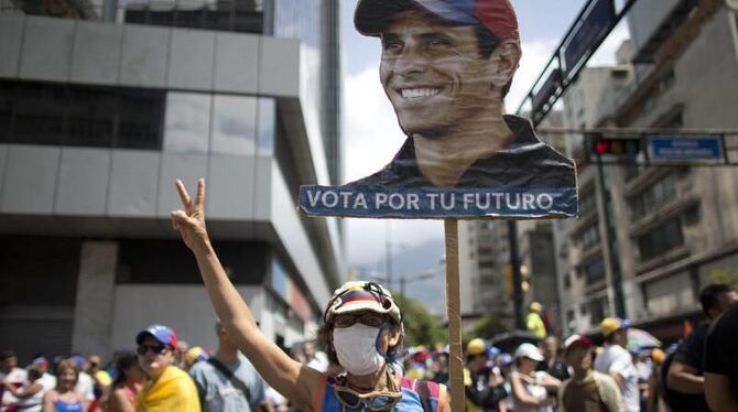 Eine Frau trägt ein T-Shirt und ein Plakat mit dem Konterfei des venezolanischen Oppositionsführers Henrique Capriles. Foto: Ariana Cubillos