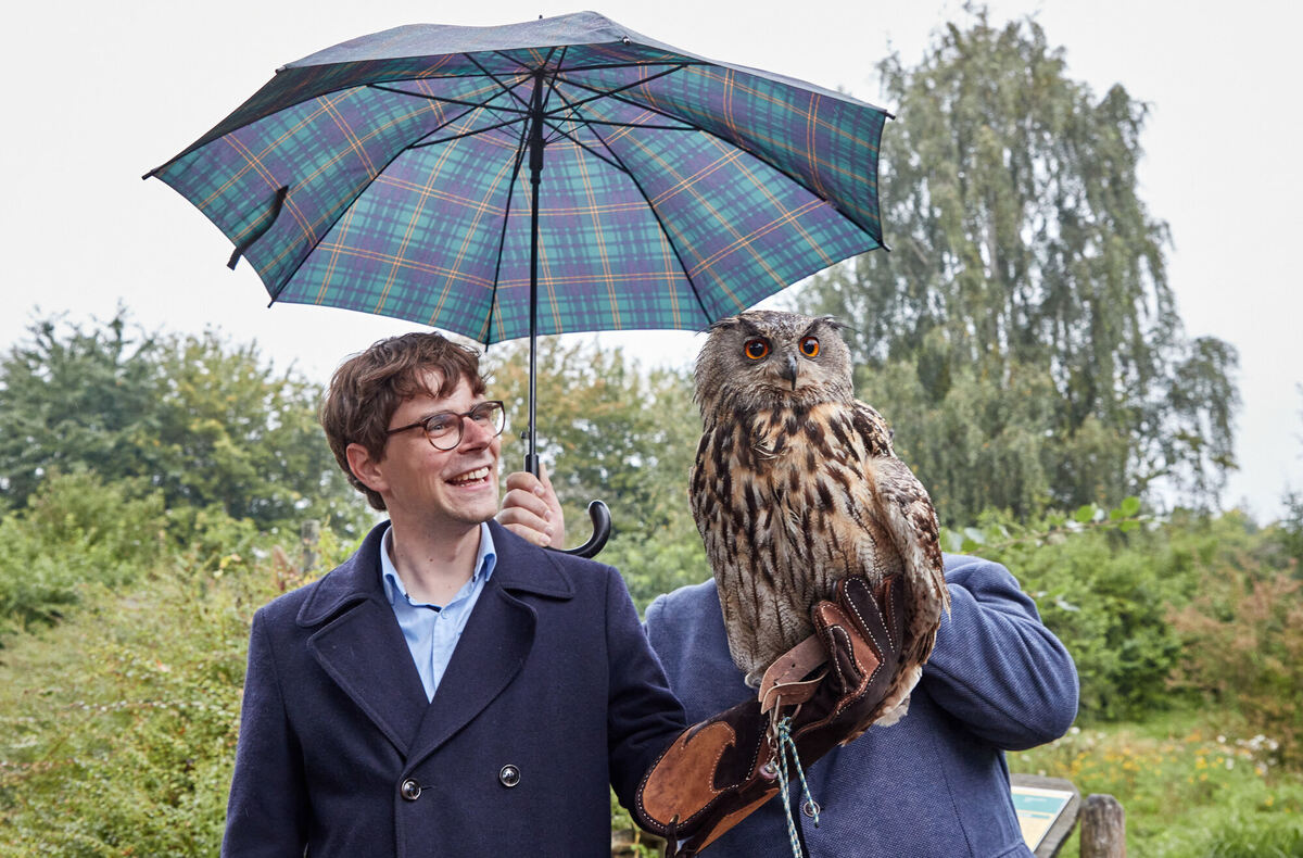 Auch die Wellensittiche waren zutraulich und fraßen der scheidenden Regierungschefin aus der Hand. Nur beim europäischen Uhu war Merkel zurückhaltend: Die ausgewachsene Eule mit den markanten Augen wollte sie dann doch nicht halten. »Ne, ne. Ich habe das bei den Sittichen gut gemacht«, sagte sie. Warum die Kanzlerin mit dem Tier nichts zu tun haben wollte, wird beim Blick auf das nächste Foto klar. Was ist das für ein Ungetüm, das da unter dem Regenschirm mit verschränkten Armen posiert?