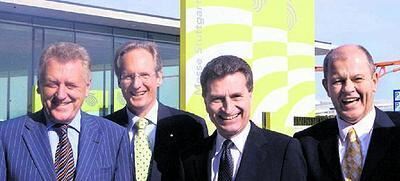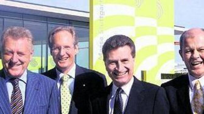 Schulterklopfen kurz vor der offiziellen Messe-Eröffnung (v. l.) : Baden-Württembergs Wirtschaftsminister Ernst Pfister, der Oberbürgermeister von Stuttgart Wolfgang Schuster, Ministerpräsident Günther Oettinger und Messe-Geschäftsführer Ulrich Kromer von Baerle.