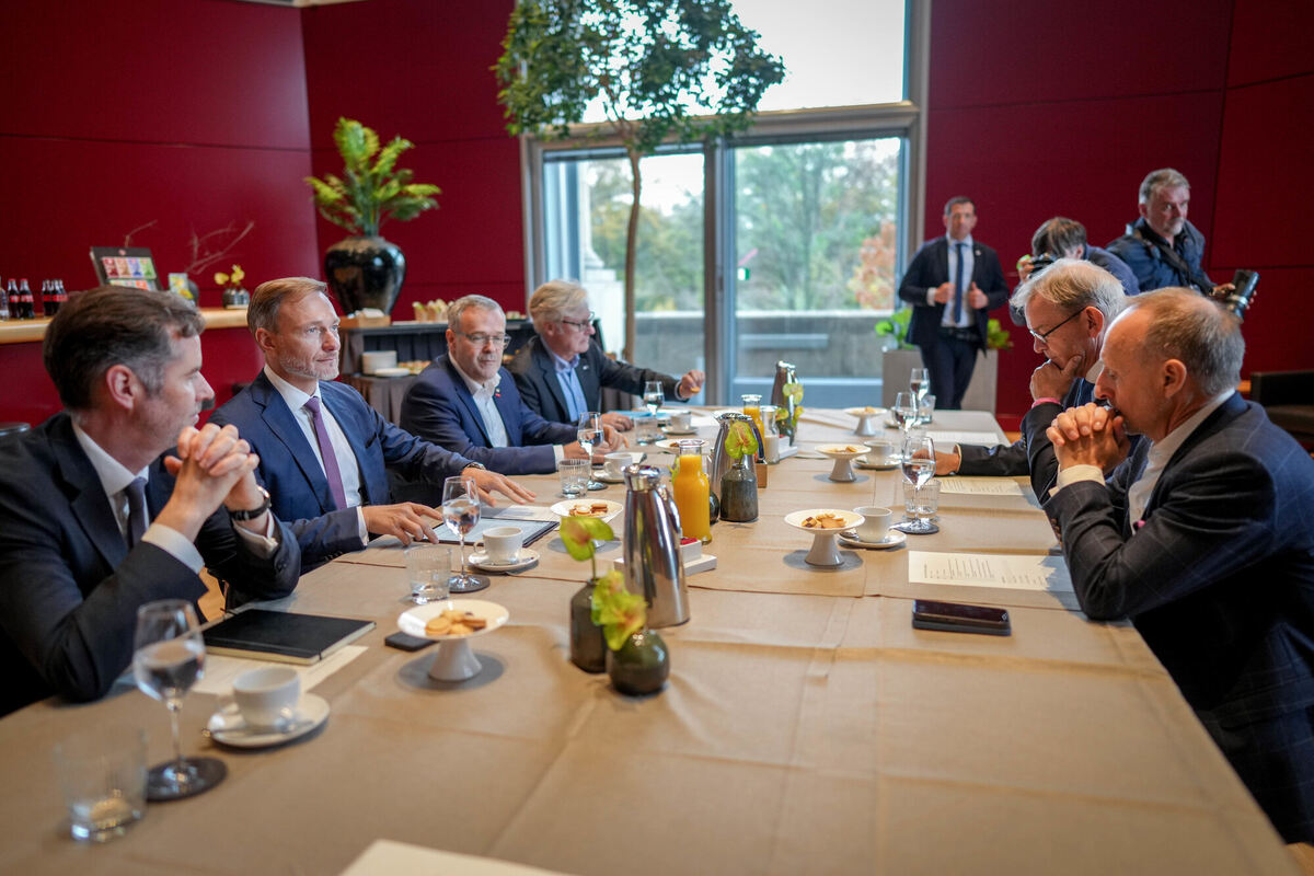 Finanzminister Christian Lindner (2. von links, FDP) nimmt mit Christian Dürr (links), FDP-Fraktionsvorsitzender, Jörg Dittrich (3. von links), Präsident des Zentralverbandes des Deutschen Handwerks, Martin Wansleben (4. von links), Hauptgeschäftsführer des Deutschen Industrie- und Handelskammertages, Reinhold von Eben-Worlee (2. von links), ehemaliger Präsident des Verbandes »Die Familienunternehmer«, und Steffen Hofmeister, Präsident Bundesverband der Freien Berufe e. V. (BFB), am FDP-Wirtschaftsgipfel teil. FOTO: NIETFELD/DPA