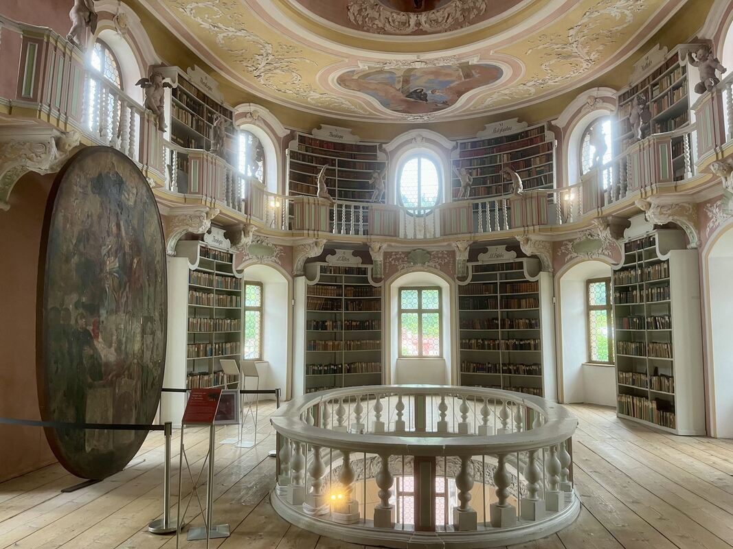 Die Bibliothek des Klosters St. Mang beeindruckt mit ihrem ovalen Innenraum.