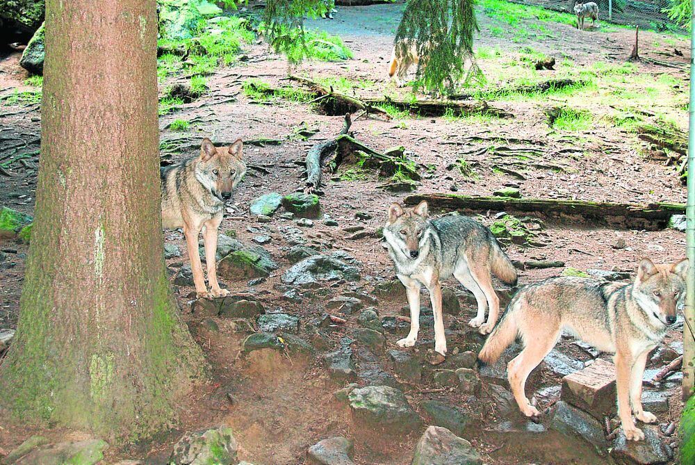 Hungrige Wölfe fixieren im Tierpark Lohberg den Pfleger, der das Fleisch bringt. FOTO: GOLDACK