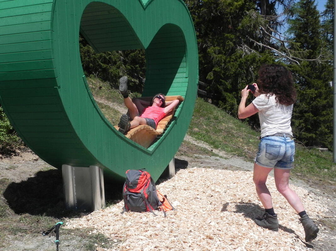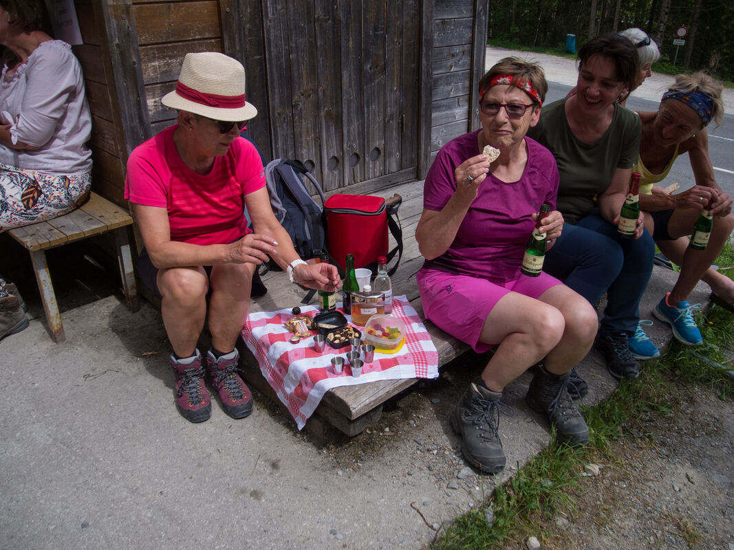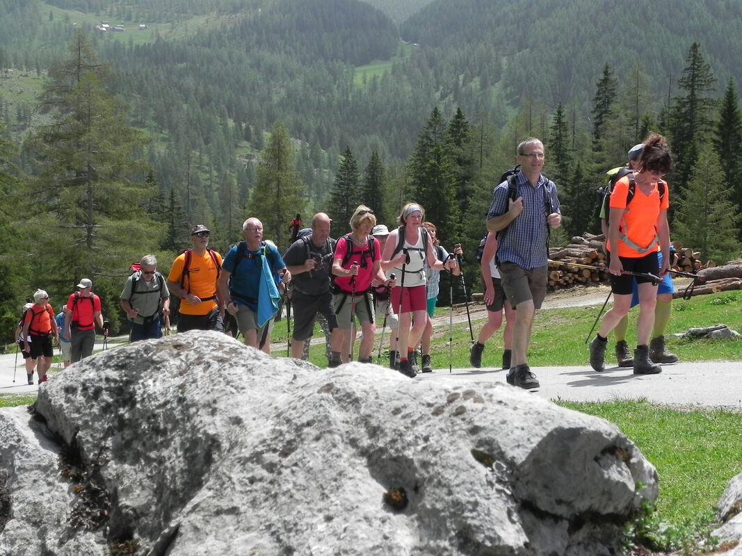 Und so wird als Auftaktwanderung eine sogenannte »Kinderwanderung « bei Filzmoos ausgewählt. Und es müssen arg zähe Kinder sein, so denkt manch einer der Mitgereisten, denen man diese Runde zumutet. Es gibt Erwachsene der Gruppe, die daran scheitern und das hat Gründe: Die frühe Abfahrt, längeres Sitzen im Bus, verfrachtet werden auf rund 1 100 Höhenmeter, noch kein Rhythmus beim Gehen und knackige Sommertemperaturen fordern den Kreislauf heraus.