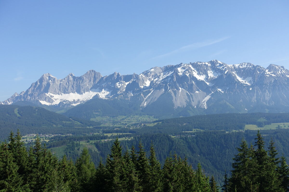 Die Dreiteilung der Gesamtgruppe bewährt sich: Es gibt die ganz sportlichen Bergwanderer, die ambitionierten und die Genusswanderer. Und während die letztere Gruppe schon in der Hochwurzen-Hütte pausiert, zu der sie vom Bergsattel unterhalb des Gipfels kommt, zieht es die beiden anderen Gruppen zuerst hoch auf den Gipfel. In den mit lichtem Wald durchsetzten Nordlagen liegt noch ordentlich Schnee, an den Wegrändern ist er bereits so weggeschmolzen, dass der Aufstieg für die Bergwanderer machbar ist. In 1 950 Metern Höhe und auf dem umgebenden Rossfeld belohnt sie ein 360-Grad-Blick mit dem gesamten Dachstein-Massiv und den Schladminger Tauern. Danach geht es auch für sie zur Hütte und von dort aus per Abstieg oder per Seilbahn ins Tal, ein paar Abenteuerlustige wagen die Abfahrt mit Karts über eine sieben Kilometer lange Piste.
