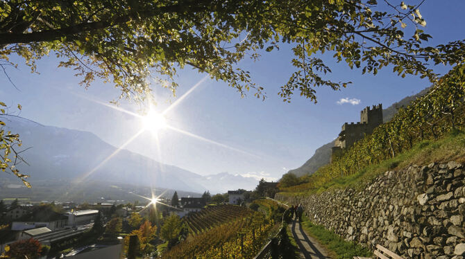 Hoch über dem Vinschgauer Thermaldorf Naturns verläuft der Weinweg am Sonnenberg, vorbei am Schloss Hochnaturns.