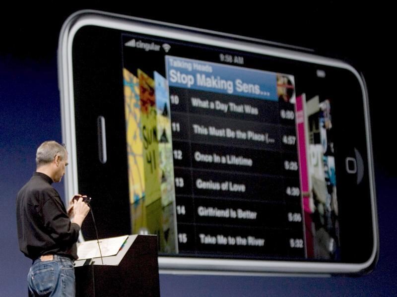 Apple-Gründer Steve Jobs präsentiert am 09.01.2007 auf der MacWorld Expo in San Francisco das erste iPhone. Foto: John G. Mabanglo