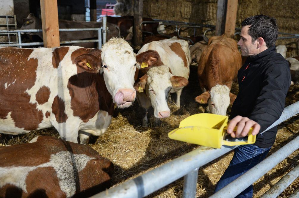 Bauer Ralph Nolle lockt mit Futter in einer Scheffel eine Kuh an. Foto: Felix Kästle/dpa
