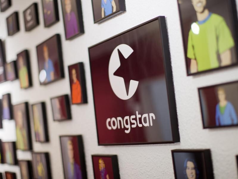 Das Logo des Telekommunikationsanbieters Congstar hängt in der Konzernzentrale in Köln in einem Flur. Foto: Rolf Vennenbernd