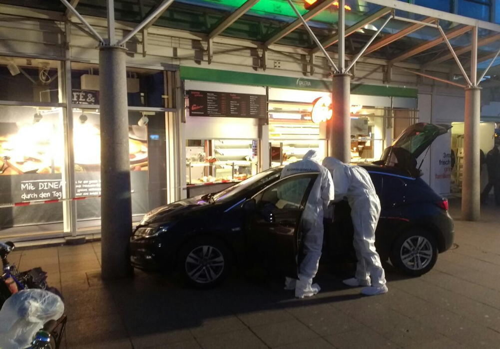 Mitarbeiter der Polizei suchen im schwarzen Fahrzeug des Täters am Bismarckplatz in Heidelberg nach Spuren. Foto: Handout/Polizei Mannheim/dpa