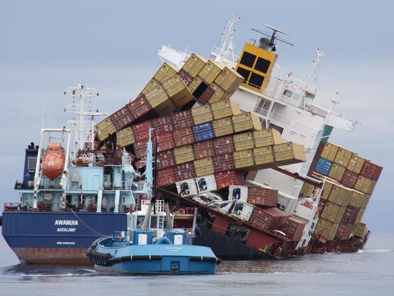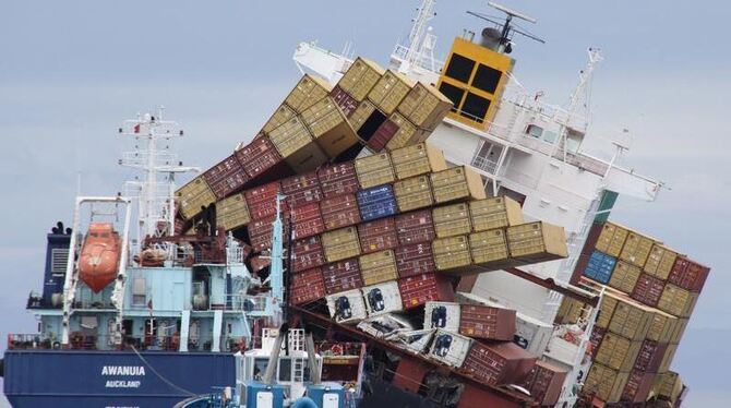 Das Tankschiff Awanuia und eine Schlepperhilfe vom Hafen Auckland pumpen Öl aus dem havarierten Schiff Rena nahe Mt Maunganui, Neuseeland. Foto: dpa