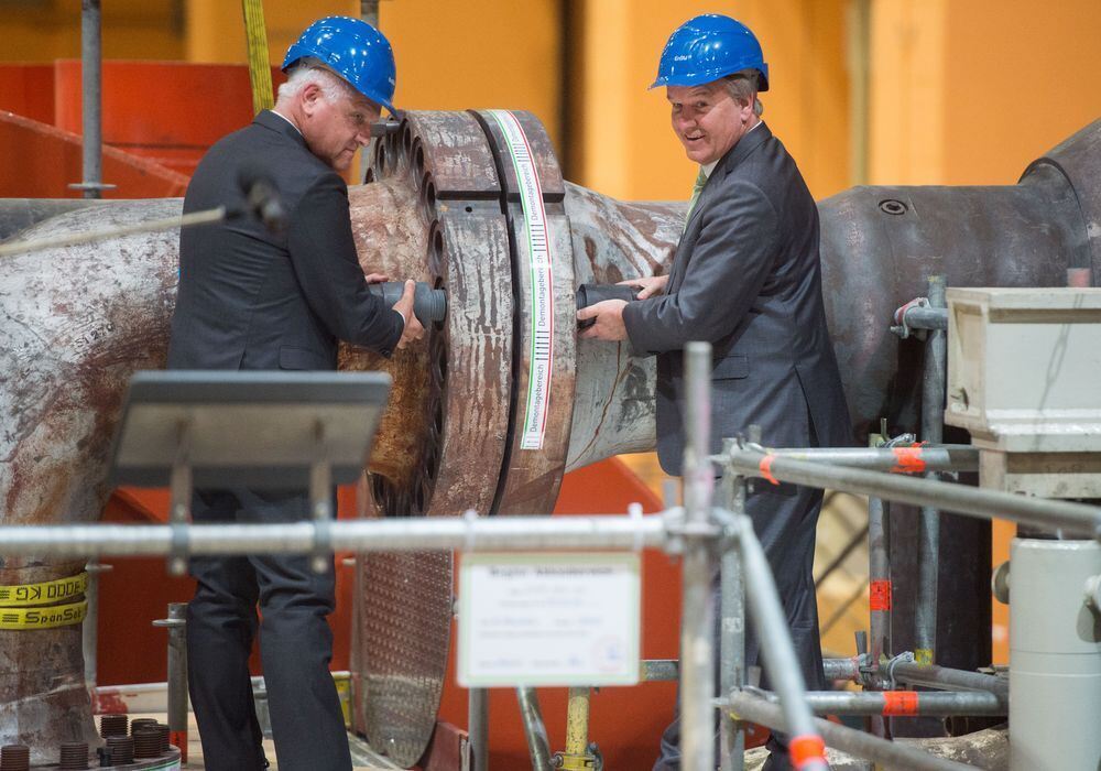 Der Technikvorstand der EnBW AG, Hans-Josef Zimmer (l) und der baden-württembergische Umweltminister Franz Untersteller schrauben zum symbolischen Start der Abrissarbeiten, im Maschinenraum des Atomkraftwerks Neckarwestheim Muttern eines Bolzens, der sogenannte Frischdampfrohre zusammenhält, ab. Foto: Lino Mirgeler/dpa