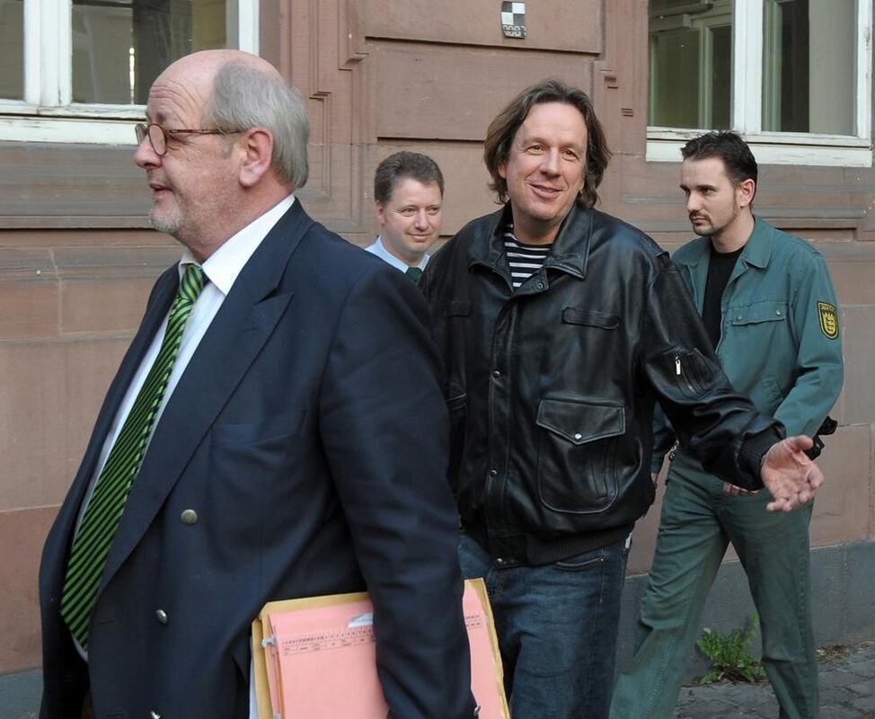Jörg Kachelmann und sein Anwalt verlassen das Amtsgericht Mannheim.