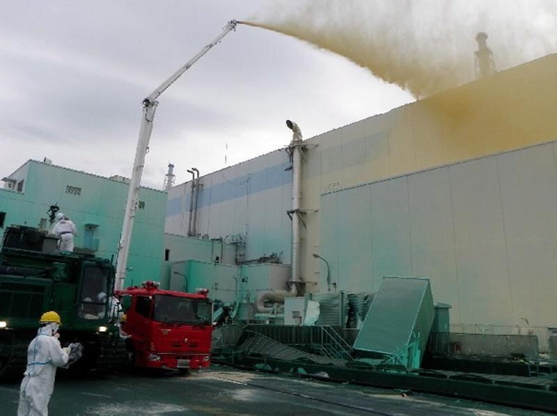 Arbeiter sprühen am 29.05.2011 ein Staubbindemittel in das havarierte Atomkraftwerk Fukushima. Tepco setzt weiter Wasser ein, um den Reaktor zu kühlen. Die Atomaufsichtsbehörde schätzt die Situation insgesamt als stabil ein. Archivfoto: Tepco