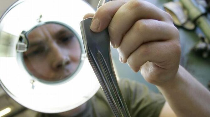 Ein Mitarbeiter der aap Implantate AG in Berlin kontrolliert in der Fertigungsanlage der Firma ein Teil eines Hüftendoprothesensystems. Foto: Steffen Kugler/Archiv