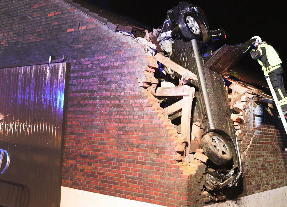 COESFELD. Als der Notruf bei Polizei und Feuerwehr gegen 21.30 Uhr am Donnerstagabend einging, war nicht abzusehen, was die Einsatzkräfte in der Appelhülsener Bauerschaft Hangenau zu sehen bekommen würden. Bei der Feuerwehr war das Stichwort »Person eingeklemmt nach Verkehrsunfall«, bei der Polizei hieß es in der Erstmeldung: »Pkw in Haus« mit dem Zusatz »Pkw hängt in zwei Metern Höhe«.