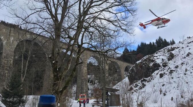 Rettungshubschrauber Christoph 54 landet in der Ravennaschlucht bei Breitnau im Schwarzwald. Nach Polizeiangaben war ein 40-jähriger Belgier und Basejumper mit dem Fallschirm von dem Ravennaviadukt gesprungen. Der Fallschirm öffnete sich zu spät. Der Mann wurde dabei schwer verletzt. Foto: Bergwacht Schwarzwald/dpa