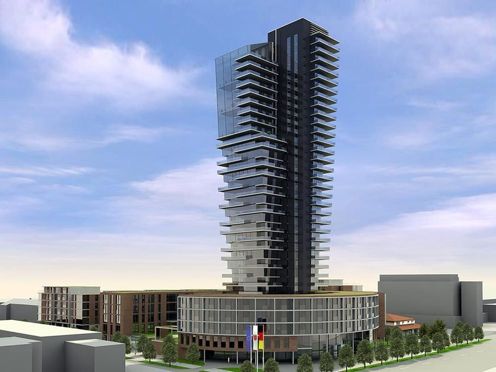 Die Computergrafik zeigt das geplante 107 Meter hohe Hochhaus, das in Fellbach entstehen soll. Grafik: Mark Worbanoff/dpa