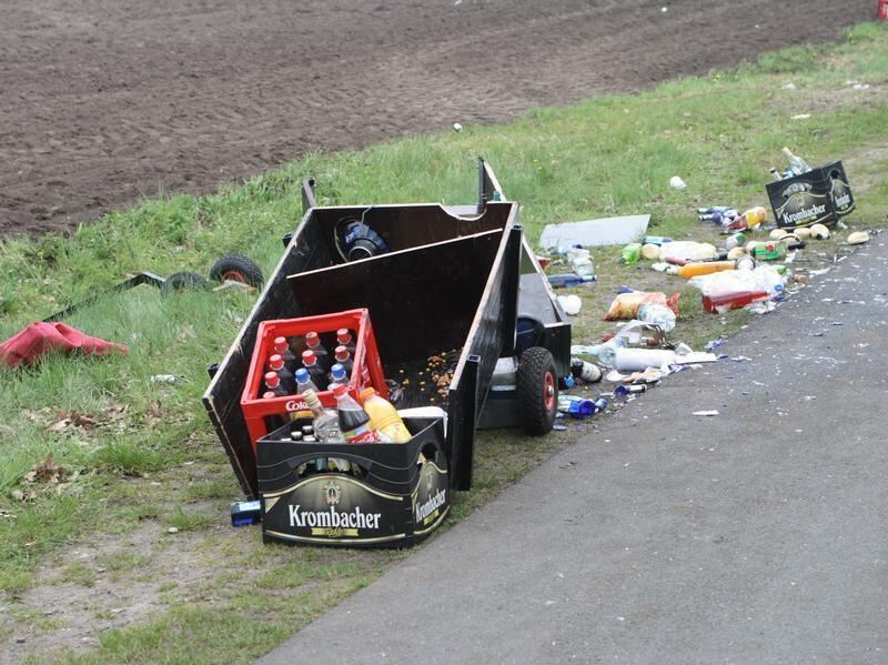 Ein demolierter Bollerwagen mit verstreutem Inhalt, nachdem ein betrunkener Autofahrer in eine Menschenmenge gerast ist.
