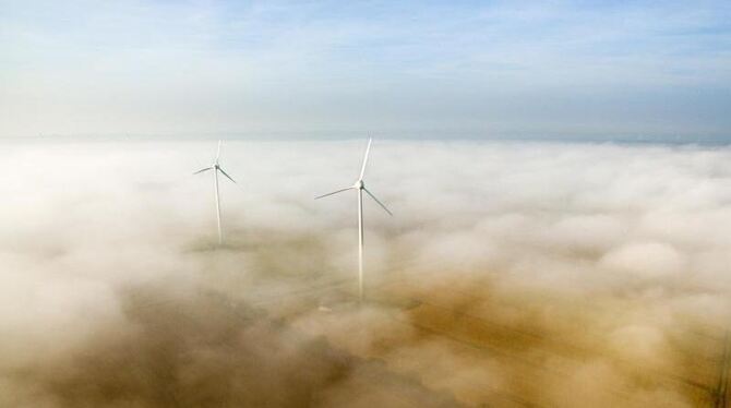 Windräder ragen aus dem Morgennebel. Foto: Julian Stratenschulte