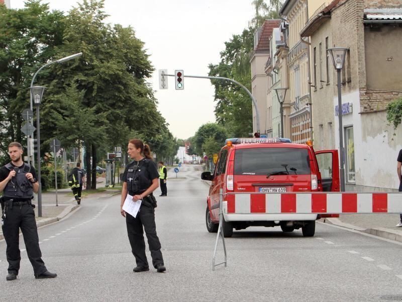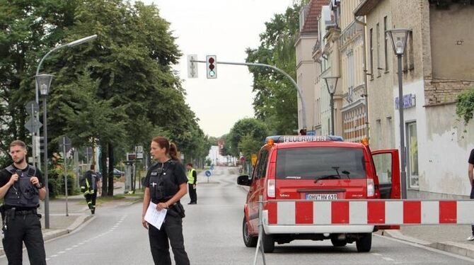Polizei und Feuerwehr sperren die Innenstadt von Oranienburg ab. Wegen einer Bombenentschärfung müssen rund 12.000 Einwohner der brandenburgischen Stadt ihre Häuser vorübergehend verlassen. Foto: Nestor Bachmann