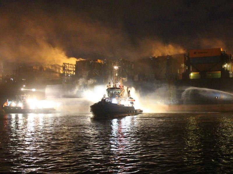 Boote der Hafenfeuerwehr löschen am 01.05.2013 den Schiffsbrand auf dem Auto- und Containerfrachter »Atlantic Cartier« im Hamburger Hafen. Foto: Marco Braun