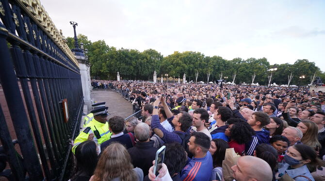 Mitarbeiter des Buckingham-Palasts brachten am Abend die offizielle Mitteilung vom Tod der Queen am Tor des Buckingham-Palasts an. Vor der offiziellen Residenz der Queen in London hatten sich bereits vor der Bekanntgabe Hunderte Menschen versammelt. Viele stimmten die Nationalhymne an und brachen in Tränen aus, als die Flagge auf halbmast gesetzt wurde.