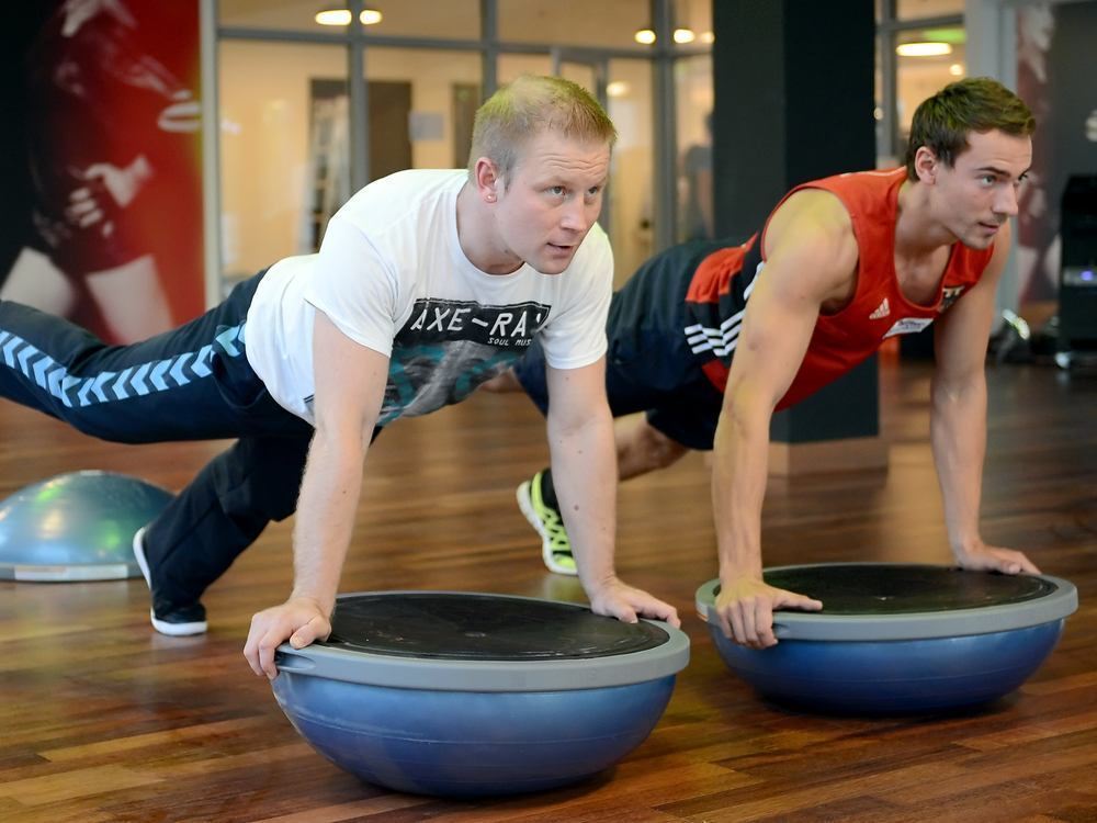 Die Trainer Teemu Mustonen (links) und Erik Vermeulen machen im Fitnessstudios »Hard Candy Fitness« mit einem Gleichgewichtstrainer eine Übung im Rahmen des Kursprogramms.