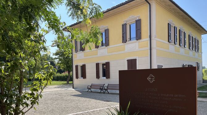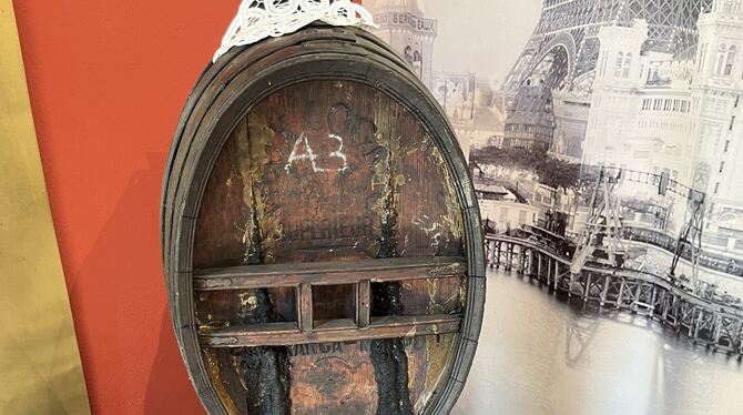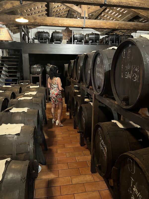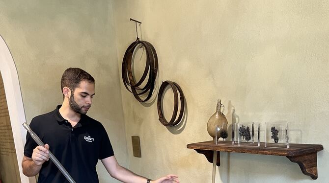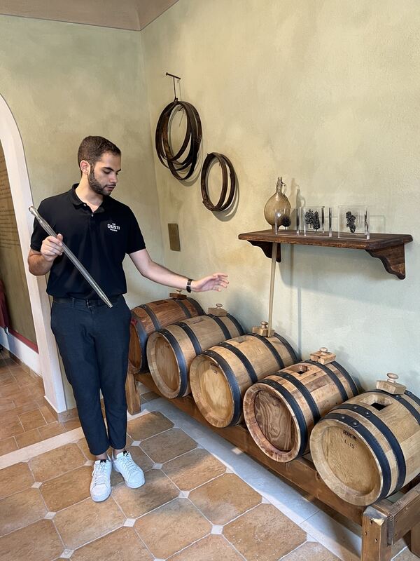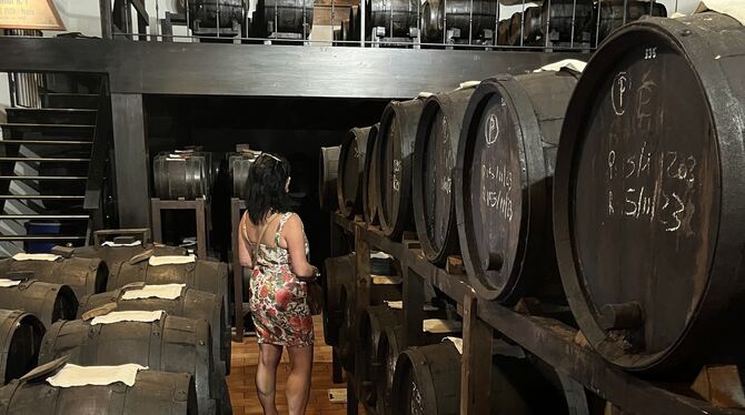 Museumsführer Nil zeigt auf eine Batterie von Balsamico-Fässern