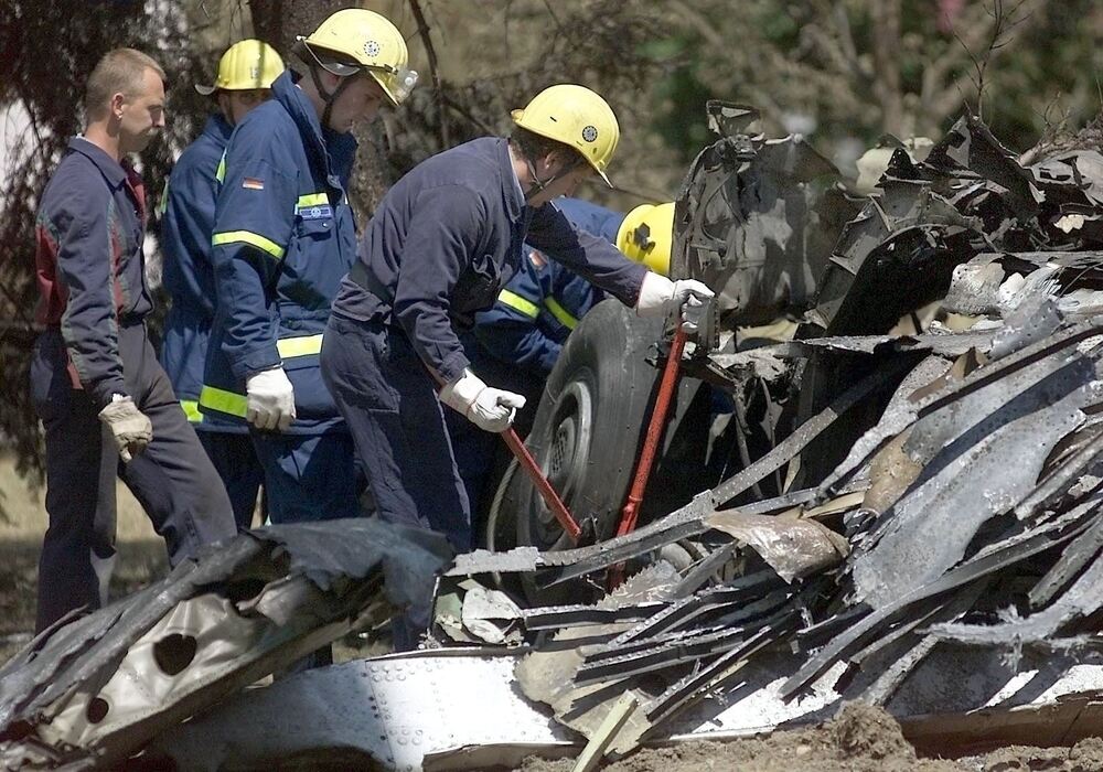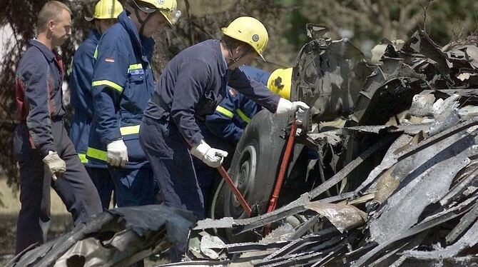 Helfer bergen 2002 bei Überlingen ein Fahrwerk und Flugzeugtrümmer der Tupolew 154.