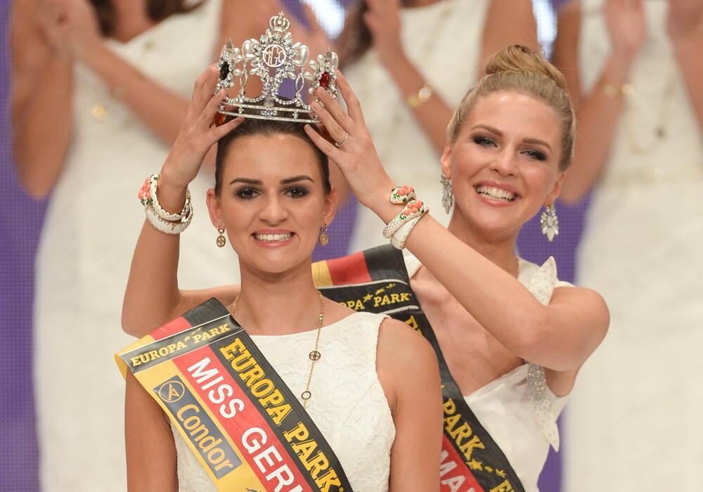 Miss Germany 2016, Lena Bröder (links) aus Nordwalde (Miss Westdeutschland), bekommt im Europa-Park in Rust auf der Bühne von Miss Germany 2015, Olga Hoffmann (rechts), die Krone aufgesetzt.