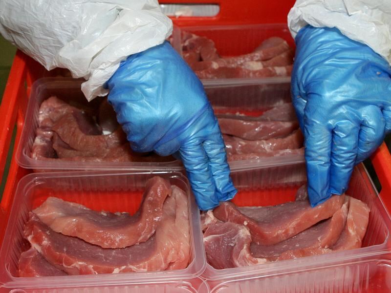 Ein Mitarbeiter einer Fleischfirma verpackt Schnitzel (Symbolbild).
