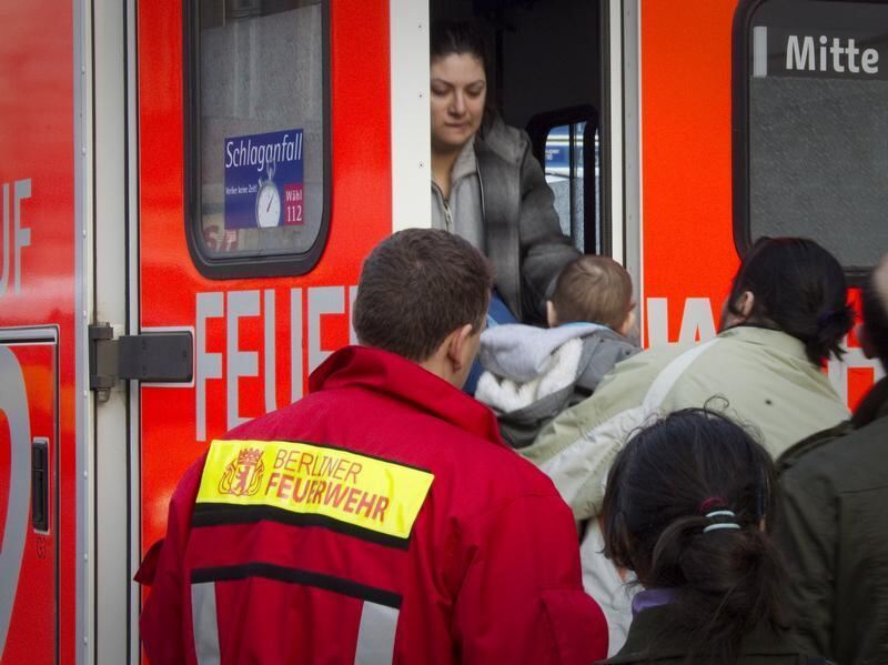 Rettungskräfte führen Betroffene in einen Rettungswagen.