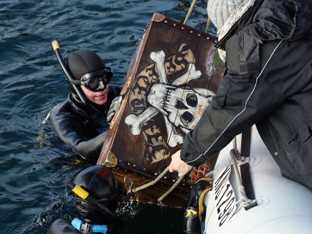 Die Taucher Torsten Werner (links) und Donya Amer hieven vor Überlingen beim traditionellen Dreikönigstauchen eine hölzerne Schatzkiste aus dem Bodensee in ein Schlauchboot. Die Schatzkiste hatten die beiden Taucher zuvor in einer Tiefe von sechs Metern in Ufernähe gefunden. Foto: dpa