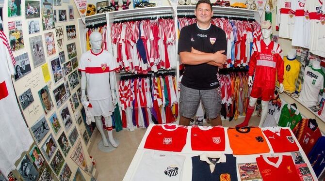Ralf Burkhart in seinem Trikot-Zimmer in seinem Haus in Nürtingen. Foto: Christoph Schmidt/dpa