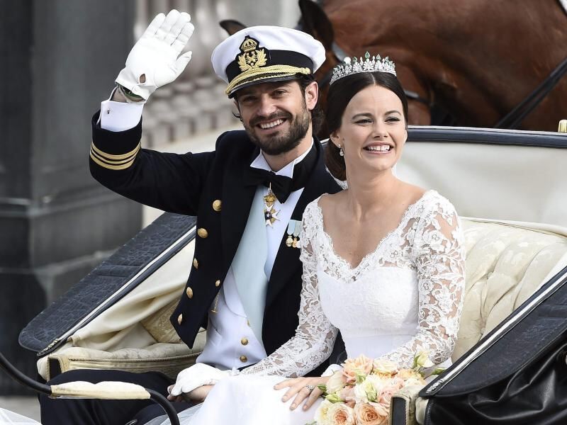 Mit der Kutsche fährt das überglückliche Brautpaar nach der Zeremonie durch Stockholm. Foto: Mikael Fritzon/TT