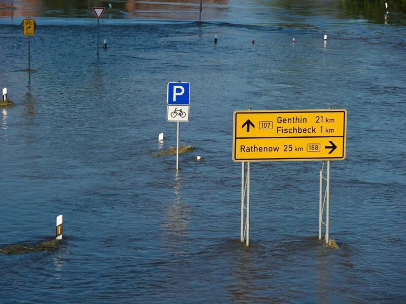 Nach einem Deichbruch an der Elbe bei Fischbeck überflutet das Hochwasser die Straße B 107 zwischen Havelberg und Genthin. Foto: Patrick Pleul