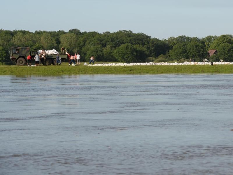 Freiwillige Helfer und Bundeswehrsoldaten stapeln Sandsäcke am Deich in Dömitz an der Elbe. Foto: Marcus Brandt