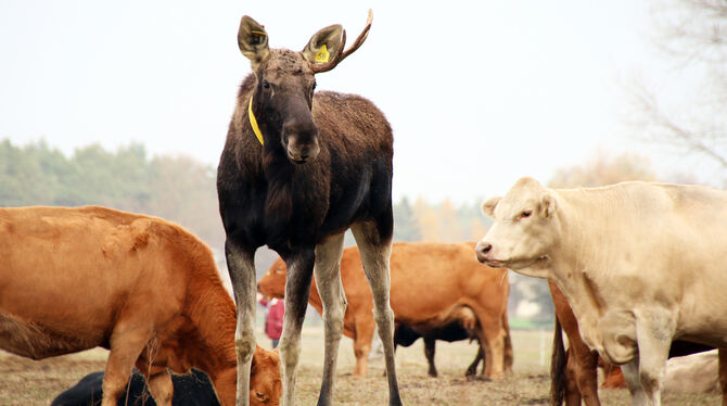 COSWIG. Ein Elch hat offensichtlich Gefallen an einer Herde Kühe in Sachsen-Anhalt gefunden. Das Tier weiche den Mutterkühen seit vier Wochen praktisch nicht von der Seite, sagte Landwirt Hartmut Schröter am Montag. Nachts verlasse der Elch die Weide, komme aber tagsüber immer wieder zur Herde zurück. »Mit seinen hohen Beinen stakst er einfach über den Zaun«, sagte Schröter.