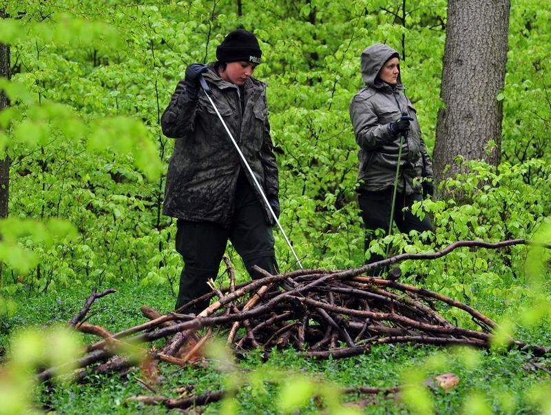 Polizisten suchen in einem Wald bei bei Heidenheim-Schnaitheim nach Spuren.