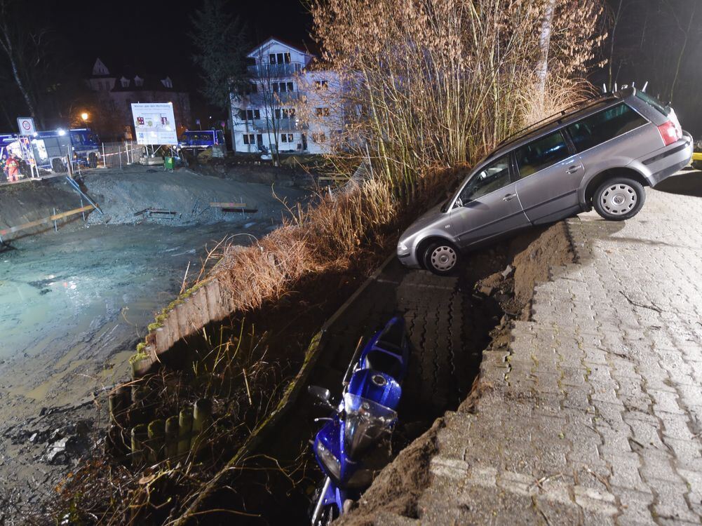 Durch einen Erdrutsch hängt ein Auto am Rand einer Baugrube, daneben steht ein Motorrad. Damit das Auto nicht abrutscht, hat es die Feuerwehr mit einem Seil an einem Laster gesichert.