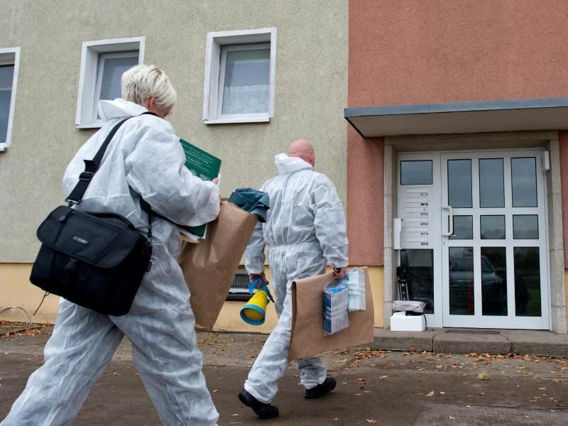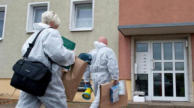 Ermittler auf dem Weg zu einem Mehrfamilienhaus im Oderbruchort Golzow, wo ein totes Baby gefunden worden war. Foto: Patrick Pleul