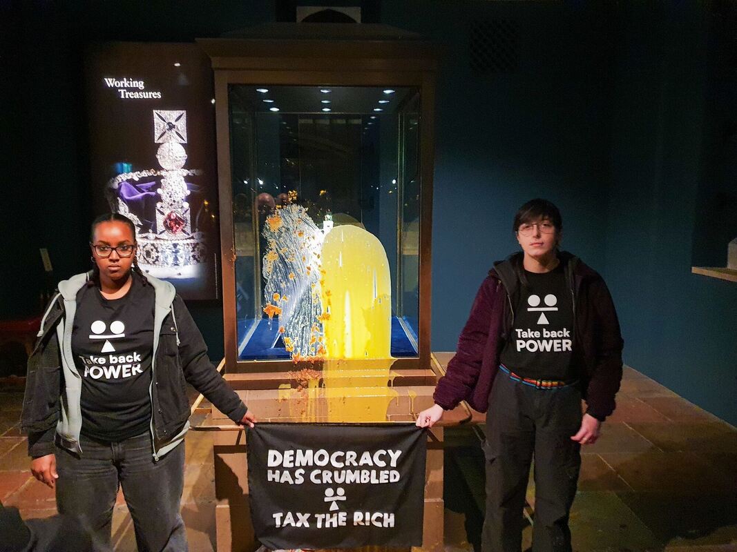 Es ist ein normaler Samstagmorgen, ehrfürchtig schreiten Dutzende Touristen durch die abgedunkelten Ausstellungsräume mit den britischen Kronjuwelen im Tower of London. Doch plötzlich packt jemand ein Kuchenblech aus und verteilt den Inhalt auf der Vitrine der Imperial State Crown. Ein zweiter Aktivist schüttet eine Flüssigkeit hinterher, mutmaßlich Vanillesoße. Symbolischer kann eine Protestaktion das Vereinigte Königreich kaum treffen.