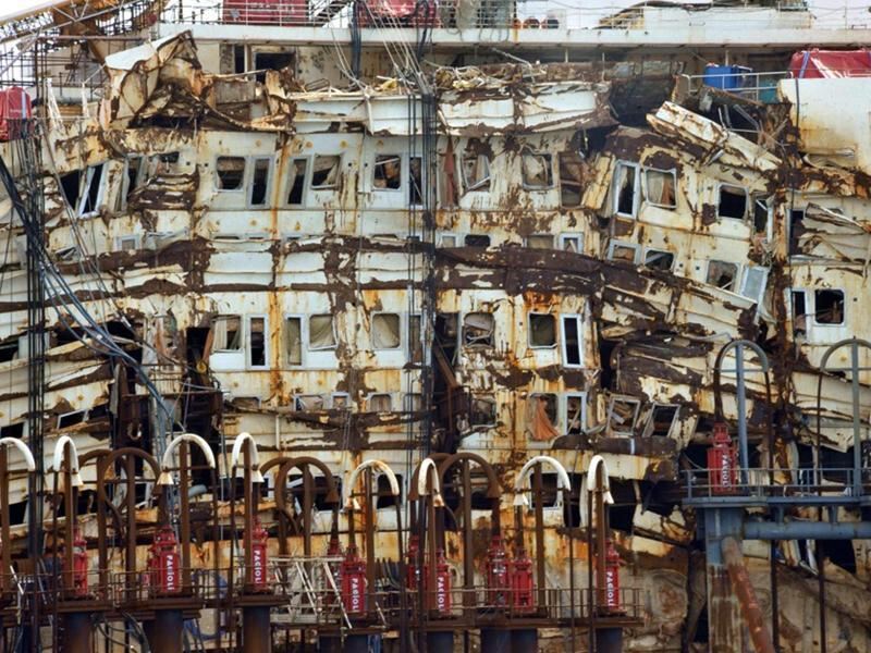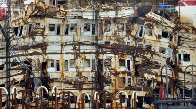Nach mehr als drei Jahren vor der Insel Giglio: die traurigen Überreste der »Costa Concordia« im Hafen von Genua. Foto: Paolo Zeggio
